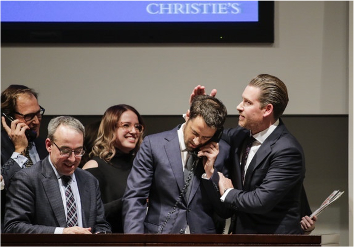 Loic Gouzer holding phone, being congratulated by Alex Rotter, right